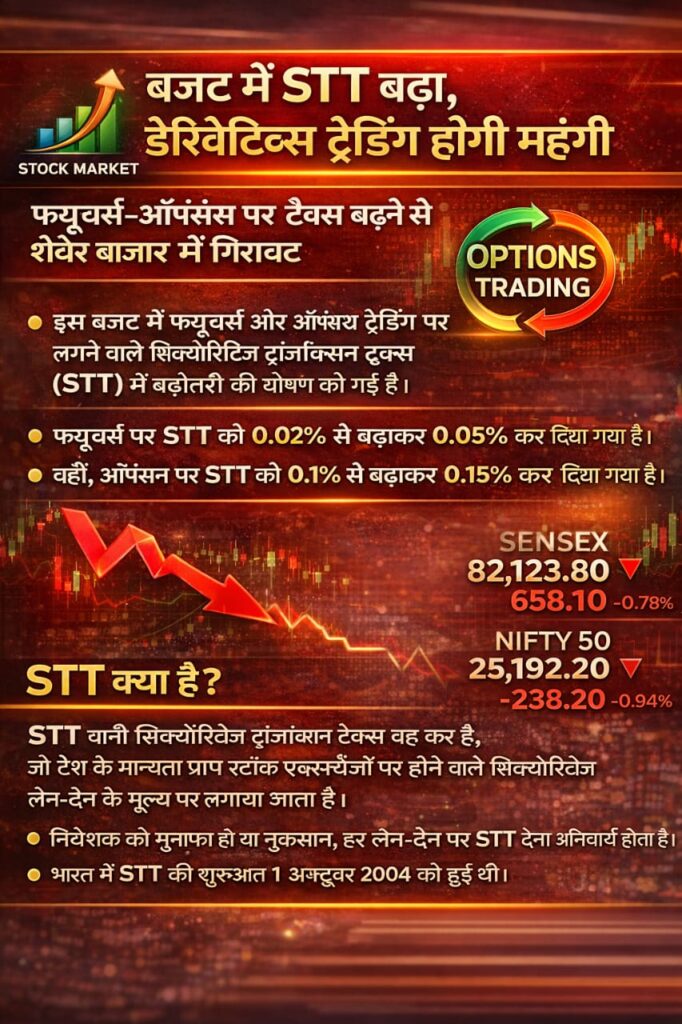 फ्यूचर्स पर STT को 0.02% से बढ़ाकर 0.05% कर दिया गया है। वहीं, ऑप्शंस पर STT को 0.1% से बढ़ाकर 0.15% कर दिया गया है। इससे डेरिवेटिव्स ट्रेडिंग की लागत बढ़ेगी।